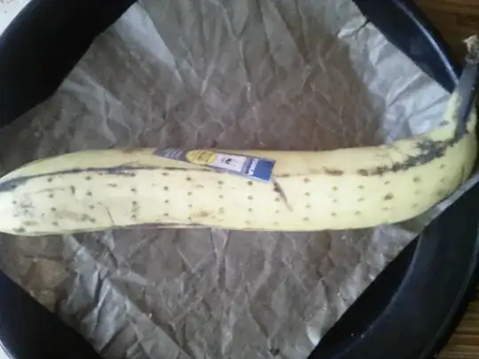 Put in the oven for a good 20 minutes, until the peel of the banana turns brown.