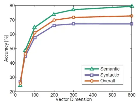 I have a collection of 200 000 documents, averaging about 20 pages in length each, covering a vocabulary of most of the English language. I'm using the word2vec embedding as a basis for finding distances between sentences and the documents. I'm using Gensim, if it matters. I'm using a size of 240. Is this reasonable? Are there any studies on what heuristics to use to choose the size parameter? Thanks.