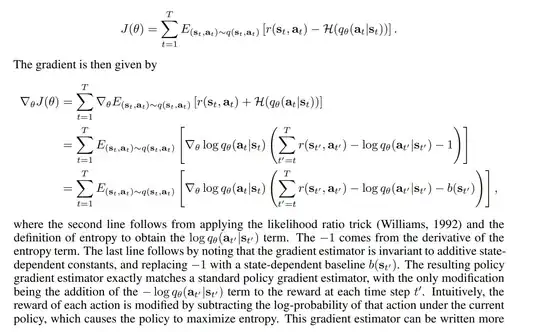 Note that in the above derivation, the term H(q(thetha(at|st))) should have been log (qthetha(at|st)), and that log refers to log base e (i.e. natural logarithm). In the first line of gradient, it should have been r(st,at) - log(qthetha(at|st)).