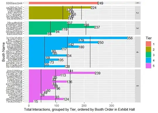 I applied a facet_grid to the data to separate by Tier. I'd like to add a trend line or at least three hlines (mean, mean ± stdev) to the graphic that sorts by position from the start of the exhibition hall to illustrate that the later the position, the less likely a vendor will be visited.