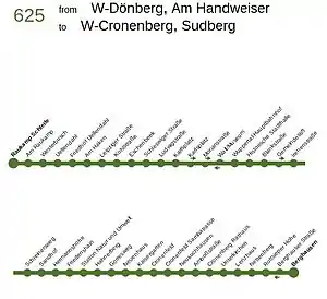 Eine dieser Anwendungen ist der Linienbandgenerator, den man aus ÖPNV-Fahrplänen kennt. Er extrahiert das Linienband per Overpass API direkt aus den OSM-Daten. Eine niedrigschwellige Bedienoberfläche findet sich hier. Schneller läßt sich beispielsweise das Band der Buslinie 625 im Verkehrverbund VRR durch folgenden Aufruf in der Adresszeile des Browsers erzeugen: