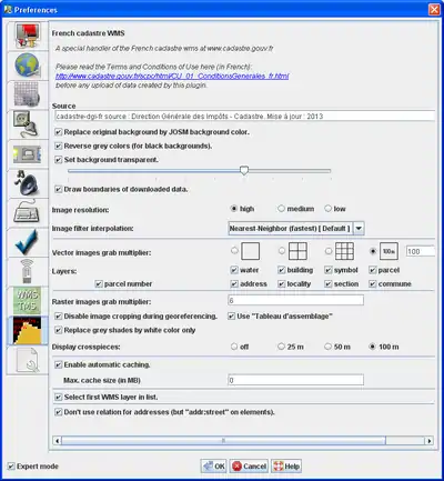 Une fois la feuille sélectionnée, celle-ci sera chargée dans JOSM par petits morceaux pour obtenir une image lisible, même après rotation. Par défaut, la feuille est découpée en 5 x 5 carreaux mais il est possible de changer ce nombre dans le menu des préférences (F12) du plugin (le découpage pouvant aller de 1x1 à 10x10 dans le champ "Raster images grab multiplier"). Plus vous augmentez le nombre de découpages, meilleure est l'image finale mais plus elle sera lourde en mémoire et longue à télécharger. A vous de trouver le meilleur compromis suivant ce qui vous recherchez sur le plan (pour pouvoir lire les numéros des maisons par exemple, un 7x7 est un minimum; alors que pour simplement tracer une rue, un 2x2 est suffisant).