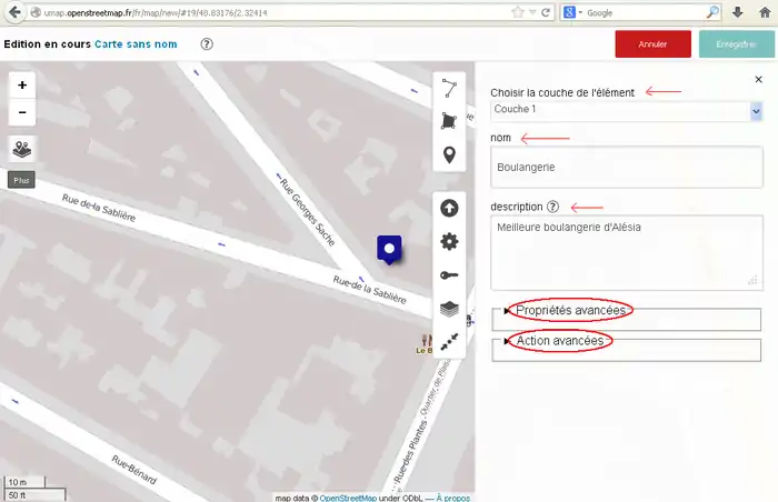 Pour changer la couleur et la forme du point, cliquez sur "Propriétés avancées". Vous pourrez également changer le pictogramme présent à l'intérieur du point ainsi que le gabarit du pop up.