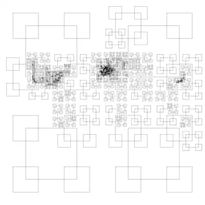 - English : This curious map of the world, shows the result of dividing the OpenStreetMap dataset into quarters until each of these vector tiles is less than 32MB in size. An experiment by Eric Fischer (details)