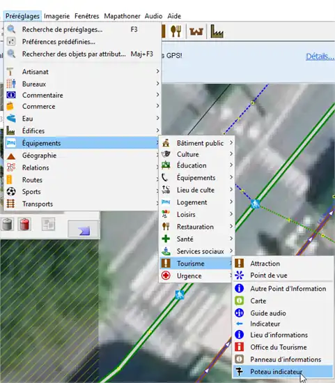 Sélectionner le panneau. Cliquer sur Équipements/Tourisme/Poteau indicateur…
