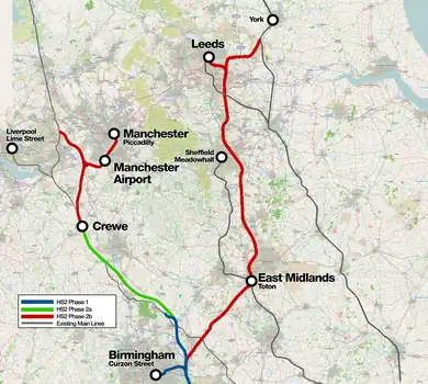 - Crewe (Phase 2a) - temporarily terminating in Crewe (proposed revamped Crewe Hub station project)