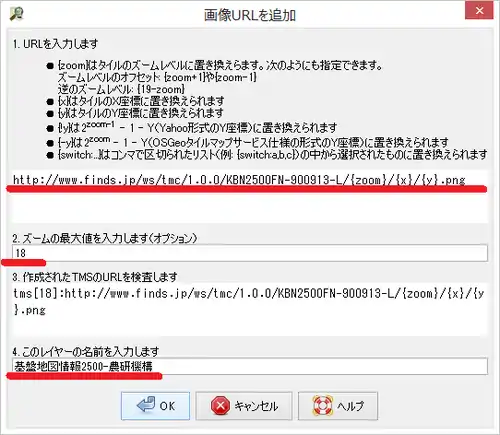 - "Name"の部分には、自分でわかりやすい名称を入力してください。(基盤地図情報25000-農研機構、など)