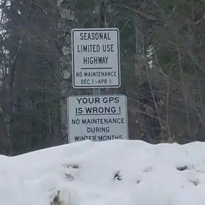Seasonal-access road. Analysis of the data shows that this code is used only on roads of class A3 and below - which makes sense; primary highways ordinarily support year-round traffic. |