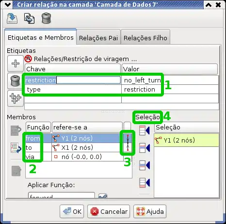 - O editor da extensão criou uma relação de restrição (etiqueta type=restriction) de proibição de conversão à esquerda (etiqueta restriction=no_left_turn. Você pode acrescentar outras etiquetas aqui, como note=* e fixme=*. Dica: se tiver curiosidade, a definição completa das relações de restrição inclui algumas outras etiquetas, mas raramente são necessárias.