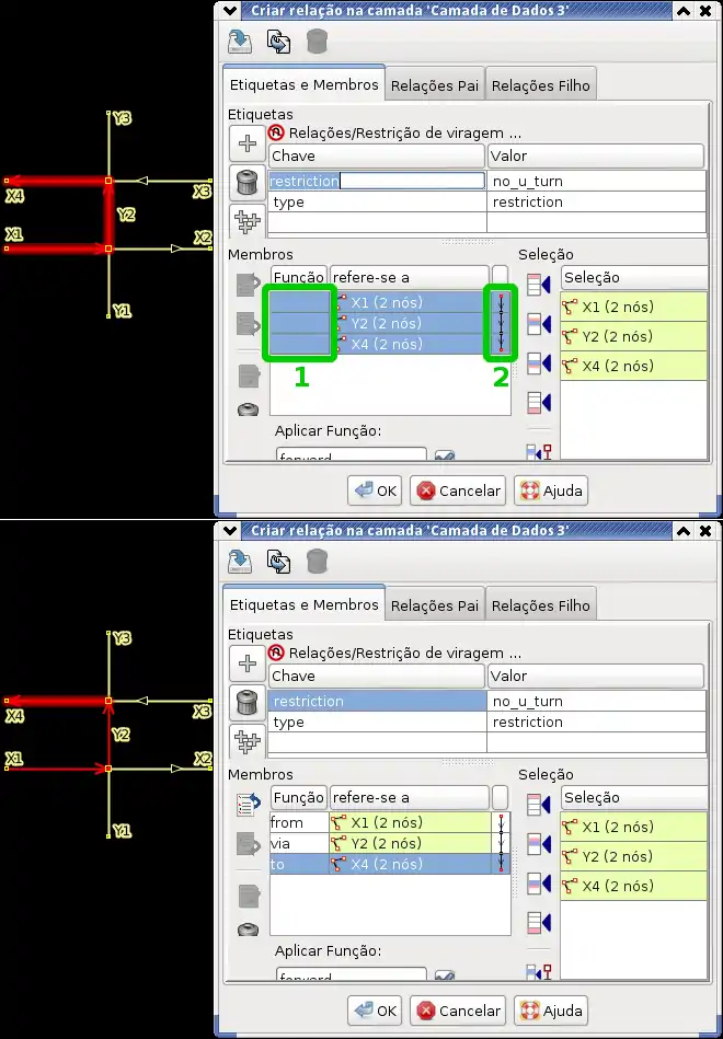 - Um detalhe que costuma passar despercebido: essa coluna indica a conectividade dos membros da relação. Ela diz se o extremo de um membro se conecta ao extremo do membro seguinte. Aqui, Y1 está conectado a X1 pelo mesmo ponto, e por isso essa coluna representa a conexão como uma linha contínua passando por uma bolinha. Dica: experimente mover o membro via para cima usando os controles à esquerda dessa tabela e veja o que acontece com essa coluna. Essa coluna é uma curiosidade aqui, ela é realmente mais interessante em relações com uma longa lista de membros que precisam estar conectados em sequência, tal como relações de rota e relações de multipolígonos.