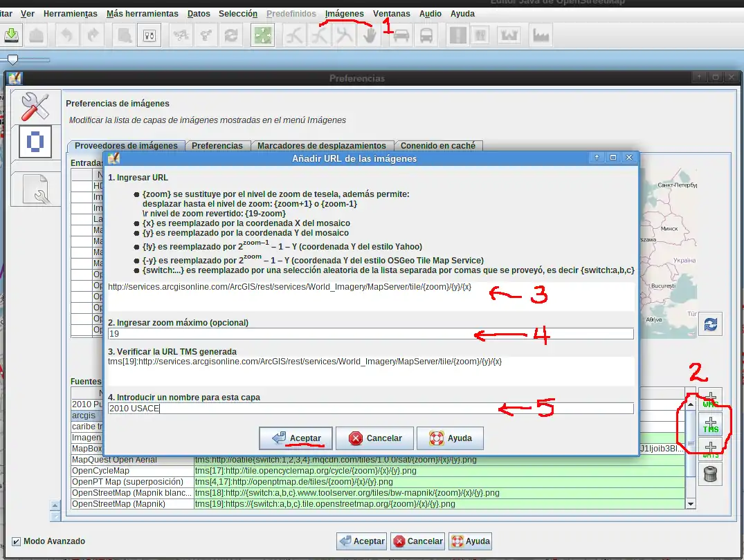 In order to prevent drawing misaligned objects, the USACE 2010 images need to be configured in iD. The following screenshot shows how to set the custom imagery: