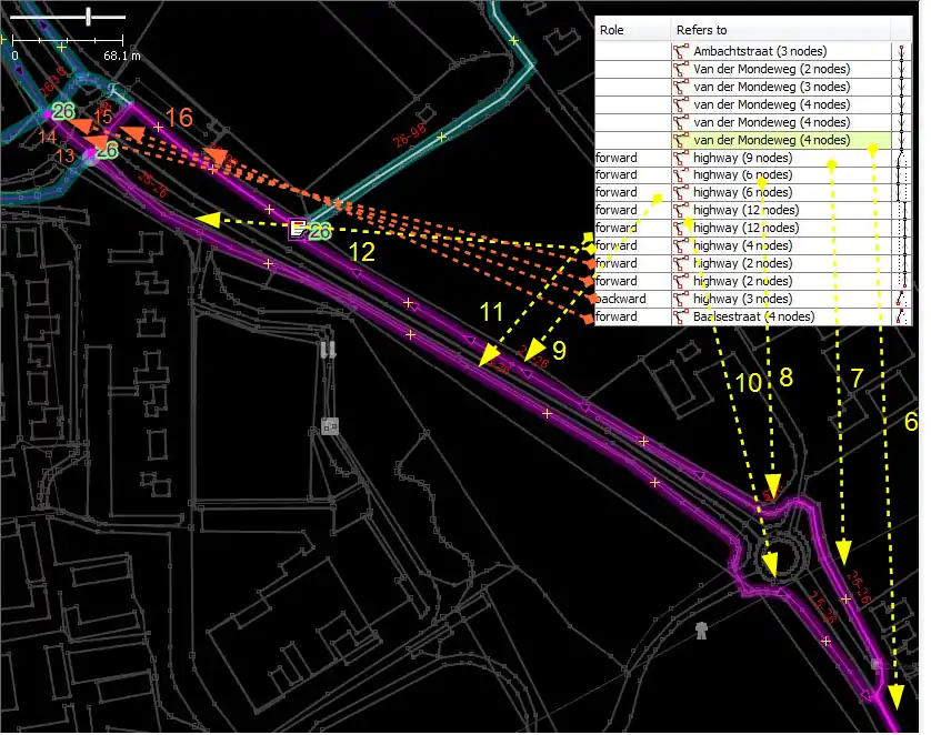 - Иногда маршруты разветвляются (из-за велосипедных дорожек по обеим сторонам улицы, улиц с односторонним движением, кольцевых развязок с разветвлёнными линиями и так далее). В этом случае сначала линии, идущие от точки с меньшим номером к большему номеру, добавляются с ролями, пока не найдём место, где ветви снова соединяются. Затем линии, по которым произошло разделение, переходят в обратные роли. Конечным результатом является то, что при проверке непрерывности можно взять всех членов без ролей и первый непрерывный набор элементов ветви для проверки направления от меньшего к большему номеру.