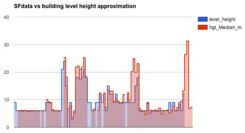 The SFdata LIDAR-derived building footprints do not necessarily line up with the traced OSM footprints. We tag an OSM footprint's height by matching it to an SFdata footprint, where the footprints are both 70% of each other's area, and then using the hgt_Median_m median LIDAR value. This eliminates instances where the OSM and SFdata datasets have different building parts tagged. The 70% threshold is enough to cover roughly 85% of OSM building footprints in the coverage area.