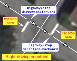• The stop on the right is mapped with direction=backward because if we follow the way, we have to look backward to see the traffic sign and we must not stop.