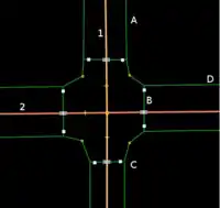 У цьому прикладі, якщо ви використовуєте зв’язки, вам треба створити зв’язок для вулиці з проїзною частиною "1" з роллю street, додати вертикальні тротуари з роллю sidewalk. У цьому випадку, всі пішохідні переходи належать обом вулицям, тож їх треба додати до зв’язку також з роллю sidewalk. Невеличкі заокруглення між вдома переходами також належать обом вулицям, тож їх потрібно відділити й також додати у зв’язок.