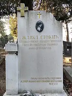 On the day when she was to be interred at the Topčider, thousands of people escorted her coffin, kneeling along the road where a bullock cart, with her casket on, passed to the cemetery.[5] Her funeral turned into the silent protest against the newly established Communist government, so as some of the later funerals of the pre-war public personalities who fell out of favor during Communism, like politicians Vlada Ilić in 1952, or Lazar Marković in 1957. She asked for two songs to be sung at her funeral, Oj, Srbijo ("O, Serbia") and Oj, Moravo ("O, Morava"). Authorities allowed only the latter.[12]
