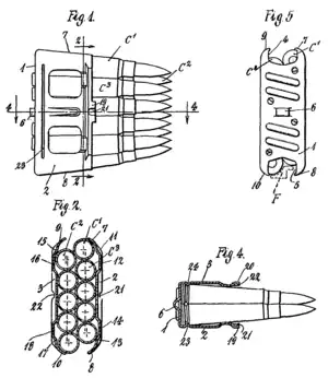 ![]() En-bloc clip loaded with 10 rounds of .276 Pedersen. Image from John Pedersen patent. | ||||||||