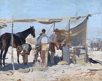 The summer months saw little action. On 22 May the Anzac Mtd Division raided the Beersheba–Auja railway, after which 1/1st Staffs Yeomanry moved to Tel el Marrakeb on the beach for a rest. In July 1917 the Desert Column was broken up into three mounted divisions under the Desert Mounted Corps (DMC), with the yeomanry brigades constituting a new Yeomanry Mounted Division (YMD) at Khan Yunis. General Sir Edmund Allenby had now taken command of the EEF, and intensive preparations were made for a renewal of the offensive in the autumn.[4][18][19][20]