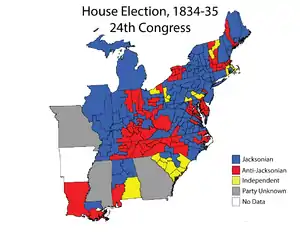 The 1834–35 United States House of Representatives elections were held on various dates in various states between July 7, 1834, and November 5, 1835. Each state set its own date for its elections to the House of Representatives before the first session of the 24th United States Congress convened on December 7, 1835. They were held during President Andrew Jackson's second term. Elections were held for 240 seats that represented 24 states, as well as the at-large-district seat for the pending new state of Michigan.