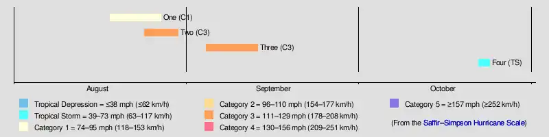 A hurricane was first seen on August 24 to the northeast of the Lesser Antilles. Resembling a Cape Verde-type hurricane, it moved to the northwest, and reached major hurricane status on the 28th. On the 29th, the hurricane peaked at 130 mph (210 km/h), but turned to the northeast where unfavorable conditions caused it to weaken. It passed south of the Canadian Maritimes, and became extratropical on August 30 to the east of Newfoundland. The extratropical storm persisted until September 2 when it lost its identity over East Anglia.