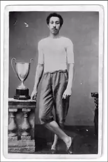 James Cowie (London AC) had won the 100 yards championship for the three previous years but wrote an open letter to Sporting Life to apologise to his many fans that he would be unable to defend his title this year due to an injury.[10] This left just two men in the first of three heats from which five men qualified for the final, to be run at three forty-five. Arthur Wharton, a student at Cleveland College in Darlington, caused a sensation by winning heat 3 in 10 seconds flat. The record at 100 yards had been in doubt for several years with many more or less dubious claims to have run ten seconds. Wharton was the first man to do it under championship conditions where there can be no doubt that all of the rules had been complied with, that the officials were fully competent and experienced men, that the time had been recorded on three accurate watches, and that neither the track nor the wind were offering any assistance.[9] In the final, forty-five minutes later, Wharton got away well and after covering 70 yards was two yards clear of the field. In the closing stages Charles Wood (Blackheath H.) narrowed the gap but Wharton reproduced his marvellous time and won by a clear yard.[3][5][11]