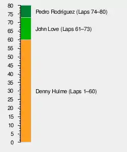 Denny Hulme led Jack Brabham away from the start, but the Australian soon spun, handing second place to Surtees, but by lap 21 had managed to regain second. Further down the field, Rhodesian privateer racer John Love reached third place in a four-cylinder Cooper Climax. On lap 41, Brabham retired, followed by Dan Gurney on lap 44. On lap 59, Hulme had to pit for more brake fluid, handing the lead to Love. His drive was halted as with just seven laps left he had to pit to take on more fuel. Rodríguez took his first win in Formula One for Cooper from Love in second place and Surtees in third.