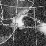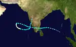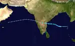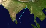 The monsoon trough spawned a tropical depression on November 14. It tracked westward, becoming a tropical storm on the November 15 and a cyclone on November 16. A break in the subtropical ridge pulled the cyclone northward, where it slowly strengthened to a peak of 125 mph winds. It hit the Andhra Pradesh coastline on November 19 at that intensity, and dissipated the next day. Strong winds, heavy flooding, and storm surge of 5 meters high killed 10,000 people,[9] left hundreds of thousands homeless, killed 40,000 cattle.[10] and destroyed 40% of India's food grains.