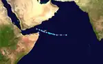 On June 9, a tropical disturbance was noted off the west coast of India in the Arabian Sea. The system moved northward, followed by a northwest turn on June 10 while the system intensified into a tropical storm. It curved toward the west, and the JTWC reported the cyclone as reaching peak winds of 70 mph (110 km/h) on June 11. The JTWC issued the final advisory at 0800 UTC on June 13 as the storm was making landfall on Masirah Island.[3] The Oman Department of Meteorology reported the storm as being much stronger than the JTWC, with sustained winds of 105 mph (170 km/h) with gusts to 140 mph (230 km/h).[4] Shortly after striking Masirah, the storm moved ashore mainland Oman, causing rapid weakening to tropical depression status. The system dissipated on June 14 after crossing into southeastern Saudi Arabia.[3]