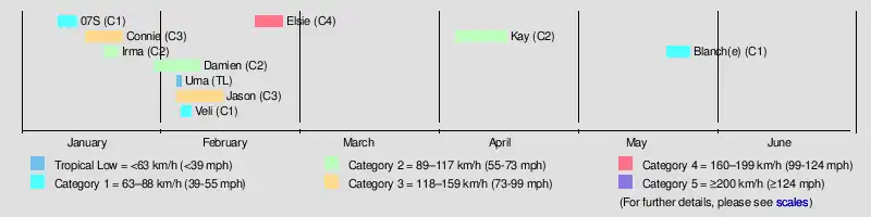 Kay19–26 AprilCategory 2 tropical cyclone100 km/h (60 mph)975 hPa (28.79 inHg)Queensland, Papua New Guinea, Northern Territory, Western Australia