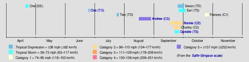 Tropical cyclogenesis in the 1992 Atlantic hurricane season began with the development of Subtropical Storm One on April 21. However, over the next three months, minimal activity occurred, with only two depressions developing, one in June and the other in July.[8] Although wind shear was relatively weak in August,[9] only one tropical cyclone occurred in that month. However, that one tropical cyclone, Hurricane Andrew, was the strongest and costliest of the season.[8] Though September is the climatological peak of hurricane season,[15] an increase in wind shear prevented tropical cyclogenesis in the first half of the month. After September 16, however, five tropical cyclones developed in a span of nine days, from September 17 to 26. Thereafter, activity abruptly halted, and only one tropical cyclone developed in October, Hurricane Frances. By October 27, Frances became extratropical, ending season activity.[16]