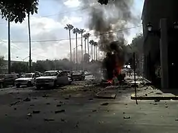 A third car bomb was abandoned on 29 June 2012 in front of the municipal palace at around 11:00 a.m., and exploded just below the office of Benjamín Galván Gómez, the mayor of Nuevo Laredo.[56] Explosives were planted inside a gray Ford Ranger pickup truck, damaging more than ten vehicles that were parked near the car bomb and destroying dozens of windows in its surroundings.[56][57][58] The detonation was heard on both sides of the U.S.-Mexico border.[59] Laredo police said they received calls from several residents reporting an explosion, and dispatched officiers to the international bridges in the Texan city. A plume of smoke was seen from the U.S. side too.[57] In addition, seven people who were near the explosion were injured.[60] The Federal police and the Mexican Army cordoned the crime scene, as paramedics stabilized the bystanders and transported them to the nearest hospital.[61] The Mexican authorities believe this car bomb attack was a form of "expression" by the criminal syndicates who operate in Nuevo Laredo and want to make their presence known.[60] The state of Tamaulipas pledged to intensify the security measures in Nuevo Laredo.[62]