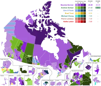 259,010 party members were eligible to vote in the leadership contest.[4] 141,000 members cast a vote. According to raw voting figures, Scheer received 62,593 votes on the final ballot compared to 55,544 votes for Bernier with 23,000 voters who had voted in the first round ranking neither Scheer or Bernier in their ranked ballot. Votes were apportioned among ridings so that each riding was allocated 100 points, regardless of the number of voters, resulting in 17,222.20 points (50.95%) for Scheer and 16,577.80 points (49.05%) for Bernier.[5]