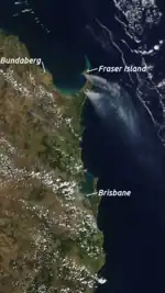 A large bushfire was started on 14 October 2020 by an illegal campfire within the Duling Camp Zone of Eastern Beach on Fraser Island.[17] It impacted multiple communities and caused people to flee their homes as it burned out of control.[18]