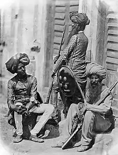 - ↑ This is a photograph about whose subjects there is disagreement in reputable academic circles. (1) www.britishempire.co.uk states the Europeans to be: Lt. Clifford Henry Mecham (standing); Major Henry Dermot Daly (seated); The Sikh officer standing at the far left with long beard is given as Man Sing; the Sikh seated on floor as Jai Singh.[2] (2) National Army Museum, London, names the European officers as: Lt. Clifford Henry Mecham (standing); Asst. Surgeon Thomas Anderson (seated). (3) The Bridgman Art Library gives the European officer seated as Major William Stephen Raikes Hodson; officer standing: Lt. McDowell and seated on the ground is Sikh officer Risalder major Man Singh. The attribution to Hodson is surely incorrect, unfortunately, as there is apparently otherwise only one extant image of this famous officer, the engraving printed as frontispiece to his biography "Rider on a Grey Horse", by B.J. Cork, 1958. There appears to be no disagreement as to the title of the photograph, or its year.