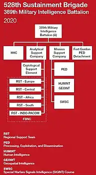 - ↑ 528th Sustainment Brigade - 389th MI Battalion Organizational Chart 2020, 528th Sustainment Brigade History Handbook Published by the U.S. Army Special Operations Command History Office Fort Bragg, North Carolina 2020, by Chris Howard ARSOF Support Historian, dated 5 December 2020, last accessed 12 December 2020