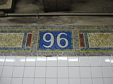 The 96th Street station is a local station on the IRT Lexington Avenue Line of the New York City Subway. Located at the intersection of Lexington Avenue and 96th Street in the Carnegie Hill and East Harlem neighborhoods of Manhattan, it is served by the 6 train at all times, the <6> train during weekdays in the peak direction, and the 4 train during late nights.