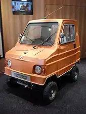 The Mini-Comtesse was the smallest car produced. It was a single seater three wheeler with two training wheels at the front to improve stability. To comply with the initial "L-category" regulations the car had a pedal which could technically speaking be used to propel the vehicle. Pushing down on the pedal would propel the car about one foot forward, thus meeting the letter of the law.[1] The car had a conventional door on one side and folding gull wing door on the other to allow it to park in extremely confined spaces. The car was front-engine, front-wheel drive by a Sachs air-cooled 49 cc single cylinder, 2-stroke, 3 hp engine connected by a centrifugal clutch to a two speed gearbox with no reverse gear. It had a top speed of 20 mph.[1] Production of the Mini-Comtesse ended in 1979.[2] Paul Clement-Colin says they were powered by a Saxonette 47 cc or Motobécane 50 cc engine.[2]