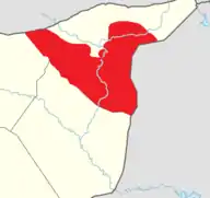Al-Barakah Province generally claimed all of al-Hasakah Governorate as its territory, though it never fully controlled the region.[3][4][6][19] By early 2016, al-Barakah Province's headquarters was al-Shaddadah, while the province had been reduced to southern al-Hasakah Governorate.[1] Following its demotion to district and move south, the administrative division covered Hajin[lower-alpha 2] and the villages of al-Baghuz Fawqani, al-Sayyal and Hasrat (which ISIL calls al-Khayrat) and Mawzan near the Euphrates, all of them part of the Abu Kamal District. Furthermore, the village of al-Bahra near Hajin was already part of al-Barakah since late 2017. Al-Barakah district in its current form is bordered by al-Furat district to its west and al-Khayr district to its northwest.[3][13]
