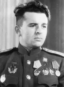 Aleksandr Terentyevich Karpov (Russian: Алекса́ндр Тере́нтьевич Ка́рпов; 17 October [O.S. 4 October] 1917 20 October 1944) was a squadron commander and flying ace in the 27th Vyborg Guards Fighter Aviation Regiment during the Second World War credited 27 individual and nine shared aerial victories, the most of any pilot in Soviet Air Defense Forces.[1][2][3]