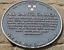 All Saints' Church is a late 18th-century church in Lower Pilgrim Street, Newcastle upon Tyne, England, which replaced a medieval church on the same site. All Saints' Church is the only elliptical church building in England, the third tallest religious building in Newcastle and the ninth-tallest structure in the city overall.[2] It is a Grade I listed building.[3]