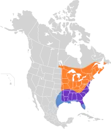 The primary breeding range extends from Atlantic Canada (Nova Scotia, Prince Edward Island, and New Brunswick) west to southeastern Manitoba, and south to northern Virginia, western North Carolina, Kentucky, northern Tennessee, northern Illinois, Missouri, and eastern Kansas. A limited number breed as far south as Florida and Texas. The species may be expanding its distribution northward and westward.[8]