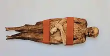 The woman was buried in a simple spruce wood coffin, her left hand holding her right arm above the wrist. The mummy was mostly intact: only the head and feet had decomposed while parts of her dress and hair were conserved. Her height was 142 cm. Skinfolds point at a stout body.