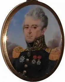 Commanding nine squadrons of the 9th and 10th Hussars and the 21st Chasseurs at the outbreak of the War of the Fourth Coalition,[7] Trelliard fought at the Battle of Saalfeld on 10 October 1806. During this action, Quartermaster Guindet of the 10th Hussars killed Prince Louis Ferdinand of Prussia in personal combat.[8] Trelliard led his cavalrymen at the Battle of Jena on 14 October.[9] Lannes posted his cavalry on the right wing at the Battle of Pultusk on 26 December.[10] Lured into attacking Russian hussars, Trelliard's cavalry suffered serious loss when the enemy cavalry wheeled aside, exposing the French to the fire of a masked battery.[11] He was badly wounded in the action. In the same month he received promotion to general of division.[1]