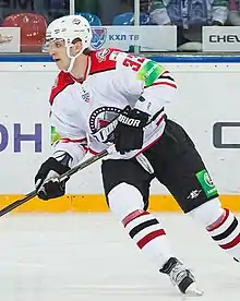 On July 1, 2008, Babchuk re-signed with the Hurricanes to a one-year contract for the 2008–09 season.[6] He led all Hurricanes' defensemen with 16 goals in 72 games. Following a contract dispute that lead to him requesting a trade out of Carolina, Babchuk turned back to Russia on 19 September 2009, re-signing with Kontinental Hockey League (KHL) club Avangard Omsk.[7] During the very first training day in Omsk, he broke the ice rink glass with a shot at Arena Omsk.[8][9] Babchuk was chosen to play on Team Yashin at the 2nd Kontinental Hockey League All-Star Game.