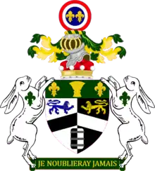 On either side a rabbit Argent charged on the shoulder with a fleur-de-lis Vert.