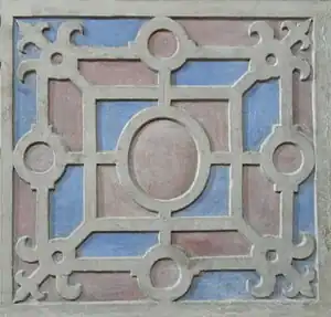 In the history of art and design, strapwork is the use of stylised representations in ornament of ribbon-like forms. These may loosely imitate leather straps,[1] parchment or metal cut into elaborate shapes, with piercings, and often interwoven in a geometric pattern. In early examples there may or may not be three-dimensionality, either actual in curling relief ends of the elements, or just represented in two dimensions. As the style continued, these curling elements became more prominent, often turning into scrollwork, where the ends curl into spirals or scrolls. By the Baroque scrollwork was a common element in ornament, often partly submerged by other rich ornament.