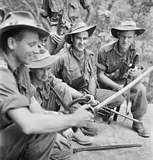 ![]() A 2/43rd Battalion mortar crew firing on Japanese positions near Beaufort on 28 June 1945 | |||||||