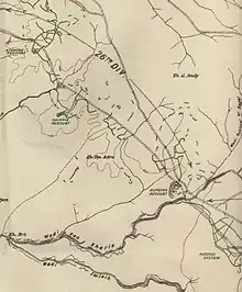By the afternoon of 2 November 60th (London) Division headquarters and the 180th Brigade group had moved to bivouac about 1.5 miles (2.4 km) south-west of Beersheba, with the 179th and the 181st Brigade group following the next day, before the 180th Brigade moved on during 4 November to bivouac south of El Muweileh, while the 181st Brigade relieved the 230th Brigade (74th (Yeomanry) Division).[21] The capture of the Ottoman line after the victory at the Beersheba, required the capture of Hareira and Sheria, to create a gap sufficiently wide for the Desert Mounted Corps to advance north to Nejile and north-east to Huj, into the Ottoman rear to cut the enemy's lines of retreat.[13] From 1 November the attacks by the Anzac Mounted and the 53rd (Welsh) Divisions and the days and nights of fighting, "played a vital part in the success of the subsequent operations, by engaging the enemy's principal reserves and defeating his counterstroke", while the concentration for the main attack on Sheria went ahead without interference.[22] Although this fierce fighting for control of the high country north of Beersheba resulted in a drawn battle, Desert Mounted Corps was able to advance to gain a "position of vantage from which to roll up the enemy's flank."[23][24][25][26]