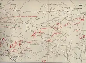The XX Corps was concentrated to the east and the south-east of the Hareira defences, ready to attack in a north-westerly direction. Once the 74th (Yeomanry) Division had captured the defences east of the railway and the railway, the 60th (London) Division was to attack and capture the Kauwukah trenches, before moving on to capture Sheria.[38] In preparation for these attacks on 6 November, careful reconnaissance was made of the Kauwukah system, including all possible lines of deployment, routes and gun positions. During the night of 5/6 November the divisions concentrated for the attack.[21]