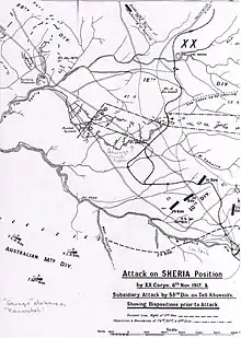 XX Corps attack on 6 November stretching from Tell Khuweilfe westwards towards Hareira